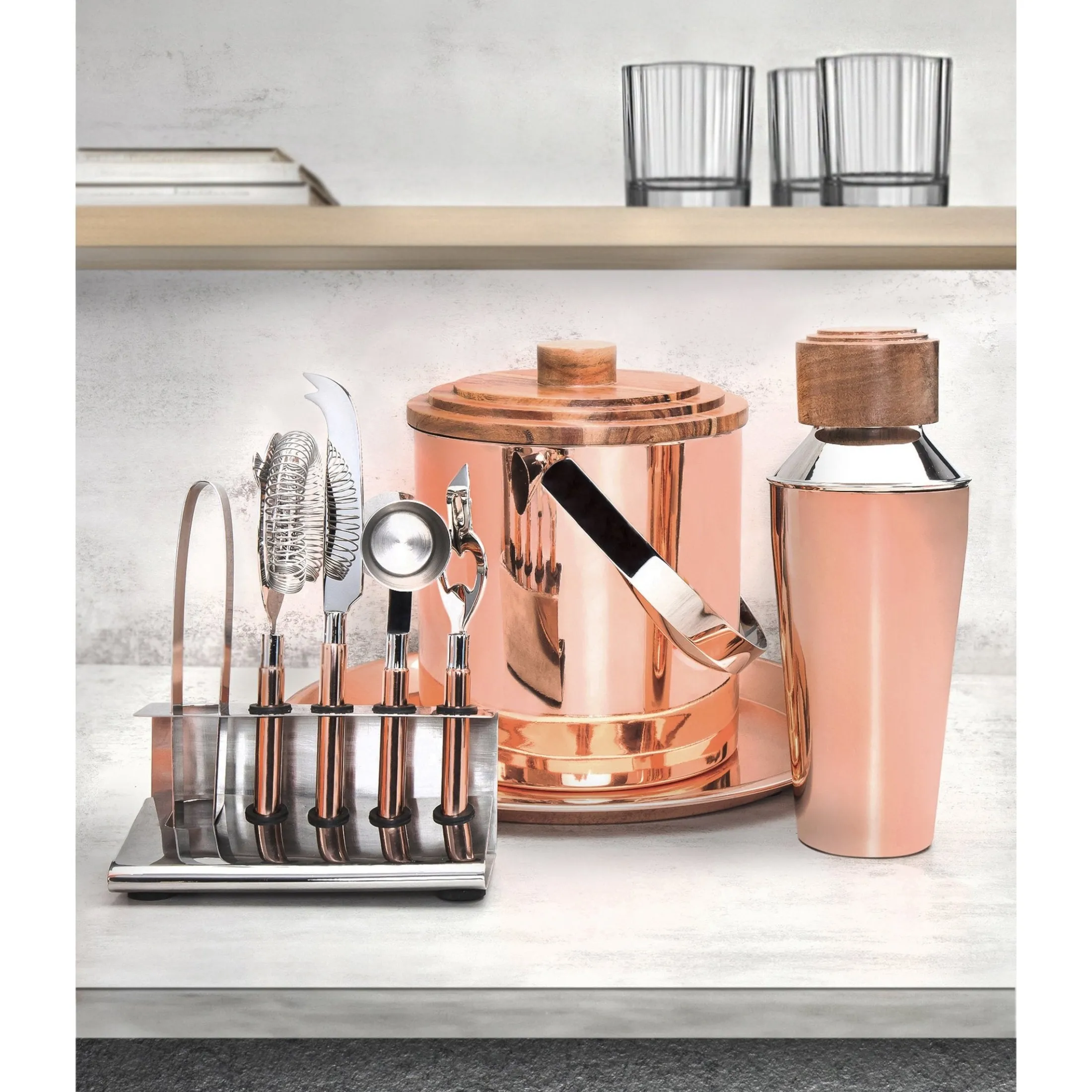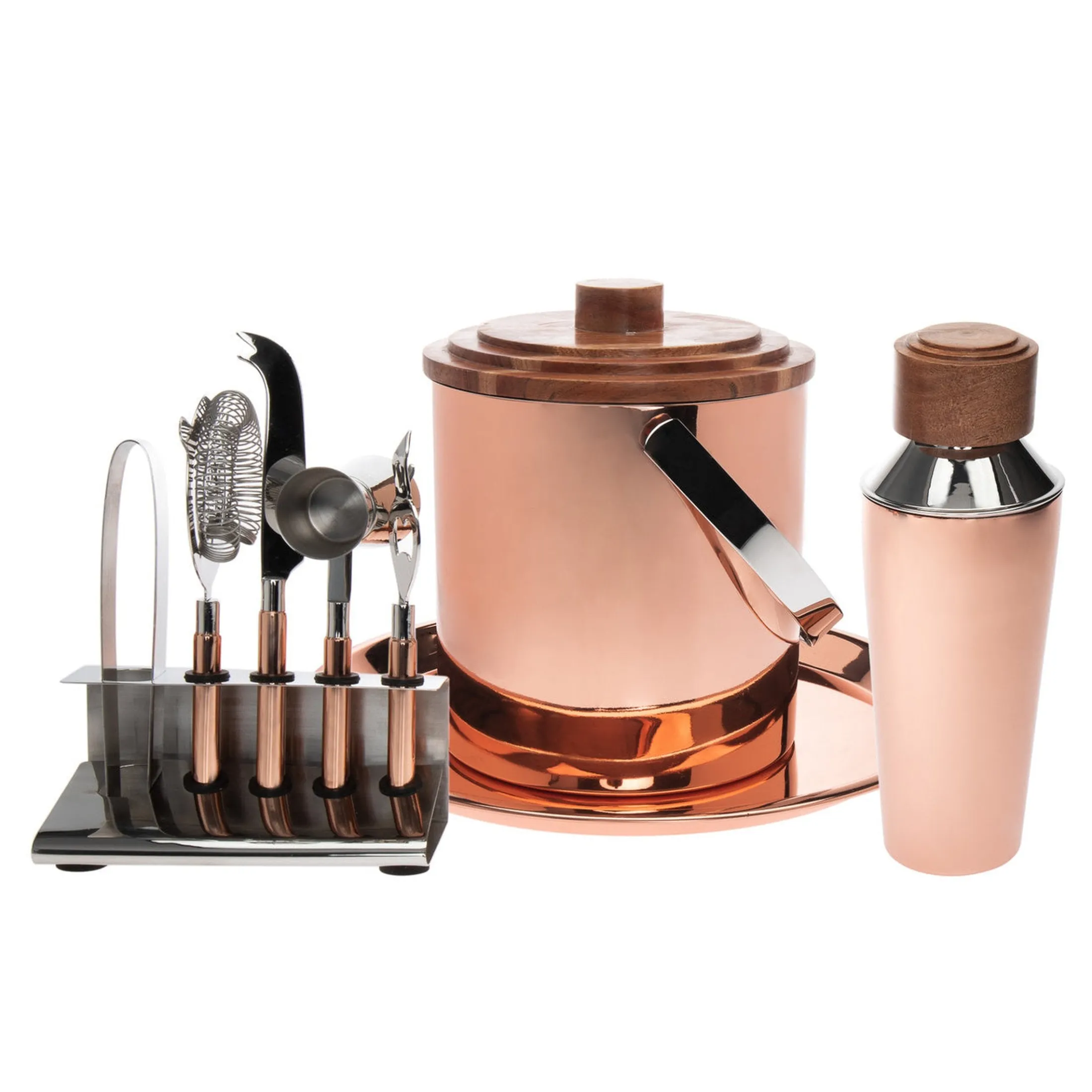 Complete any home bar in style with this elegant, handmade 9-piece bar tool set. Each piece is crafted from high-quality stainless steel and accented with Acacia wood. Perfect for entertaining guests during dinner parties or creating exquisite cocktails, this exclusive set adds an exquisite touch to any luxury home.