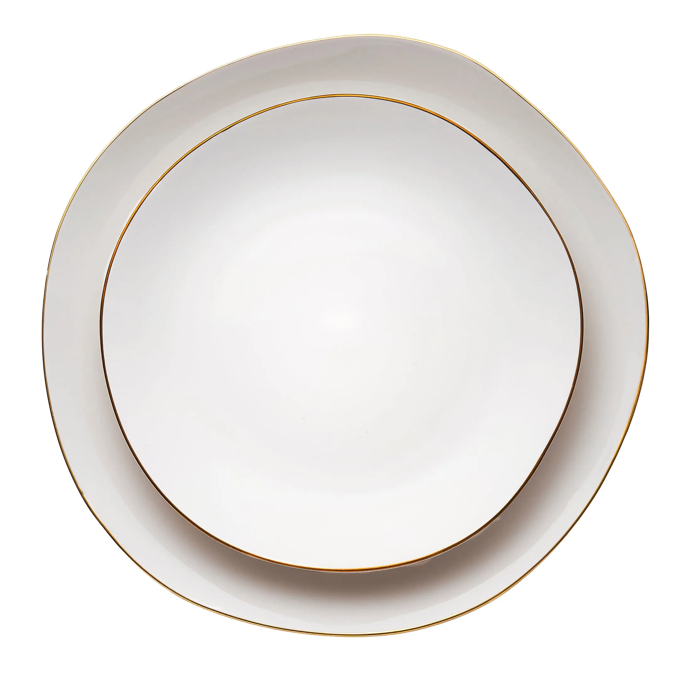A modern take on organic-shaped porcelain, this dinnerware set features a glossy finish and a luxurious gold rim, adding a touch of sophistication to any dinner. Impeccably crafted from premium porcelain, this set combines modern design and timeless elegance to bring a touch of luxury to your table.