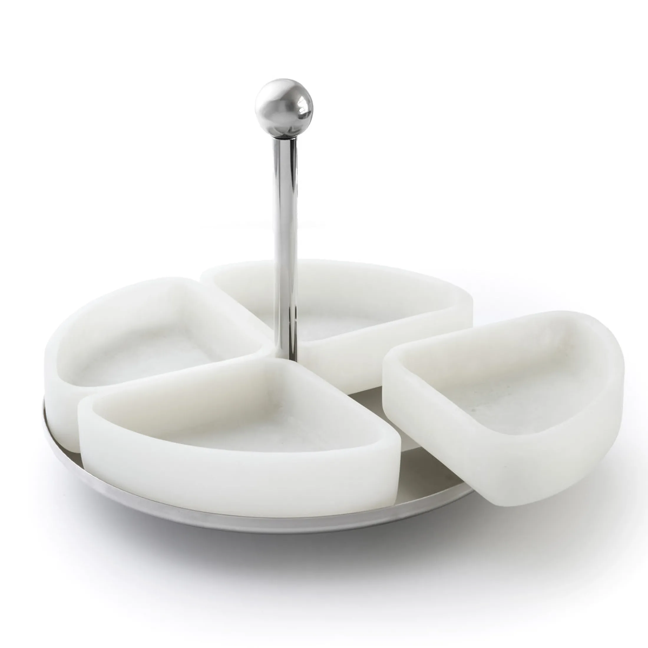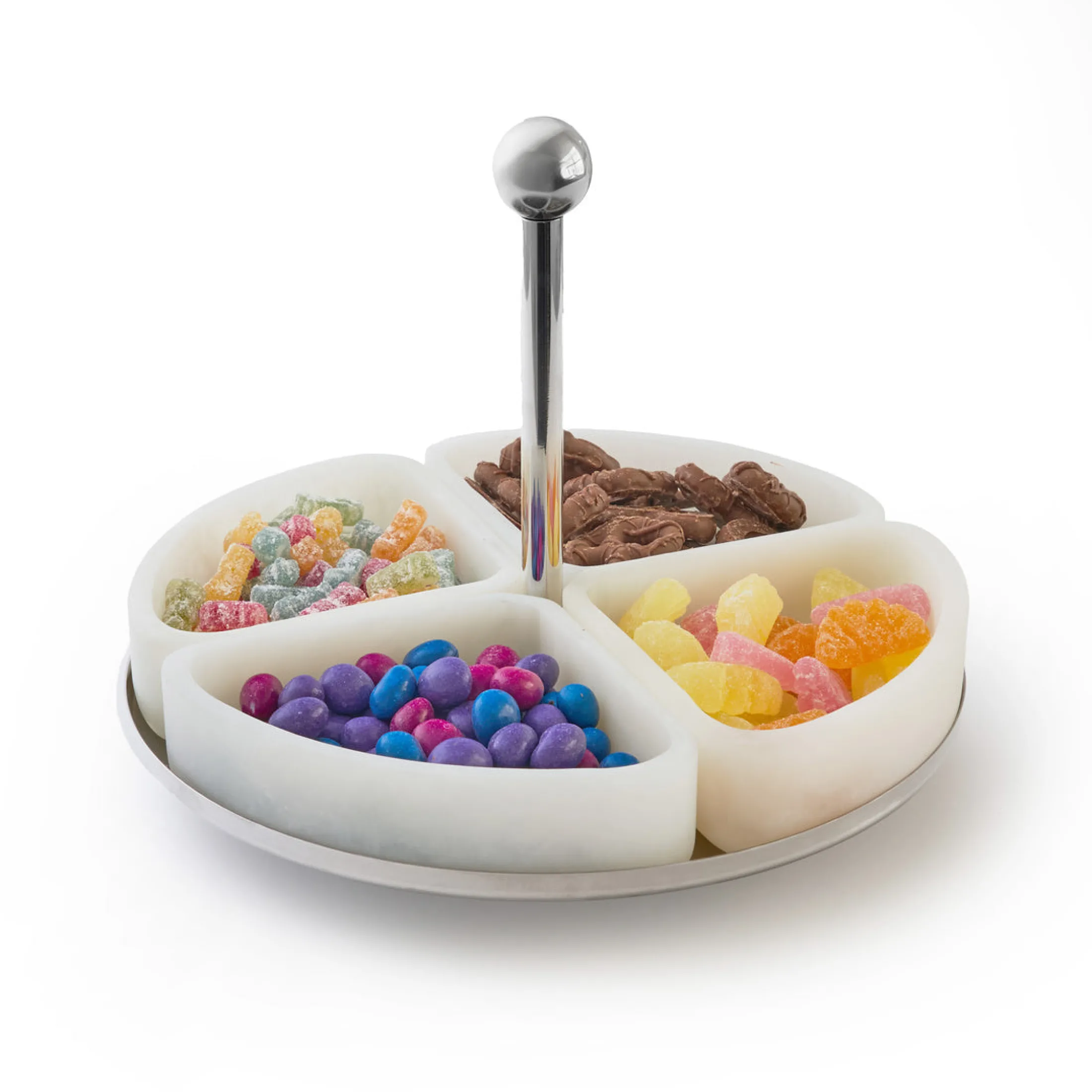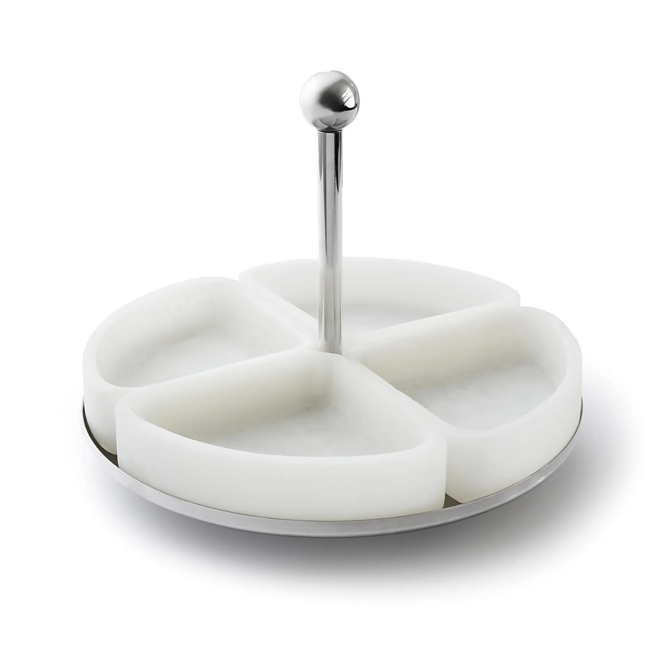 Sleek, smart, and built to serve, our Azure Matte White Resin Sectional Serving Stand is a statement piece for entertaining. The brushed stainless steel lazy Susan base allows for smooth rotation, while four removable matte white resin trays offer a modern, minimalist look. Perfect for presenting snacks, toppings, condiments, or small bites, each section lifts out easily for effortless refilling and cleanup. A beautiful blend of function and design, this stand brings organization and elegance to any tabletop.