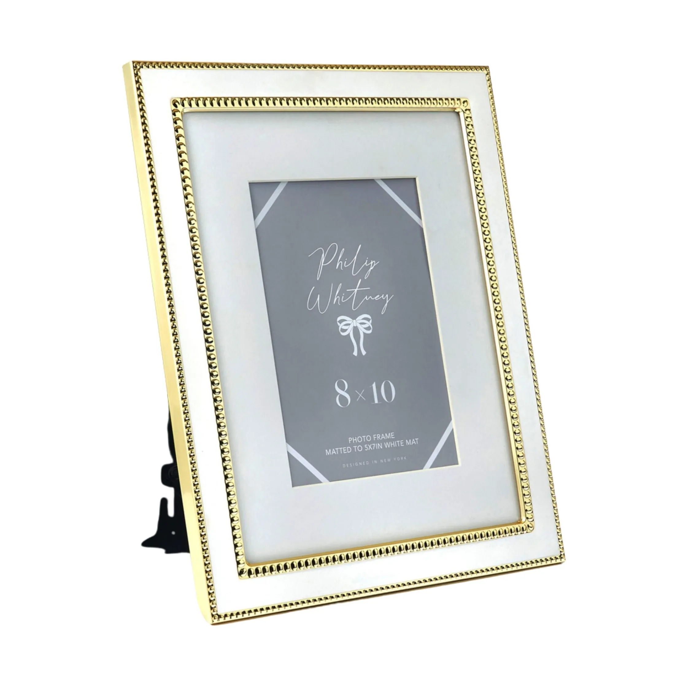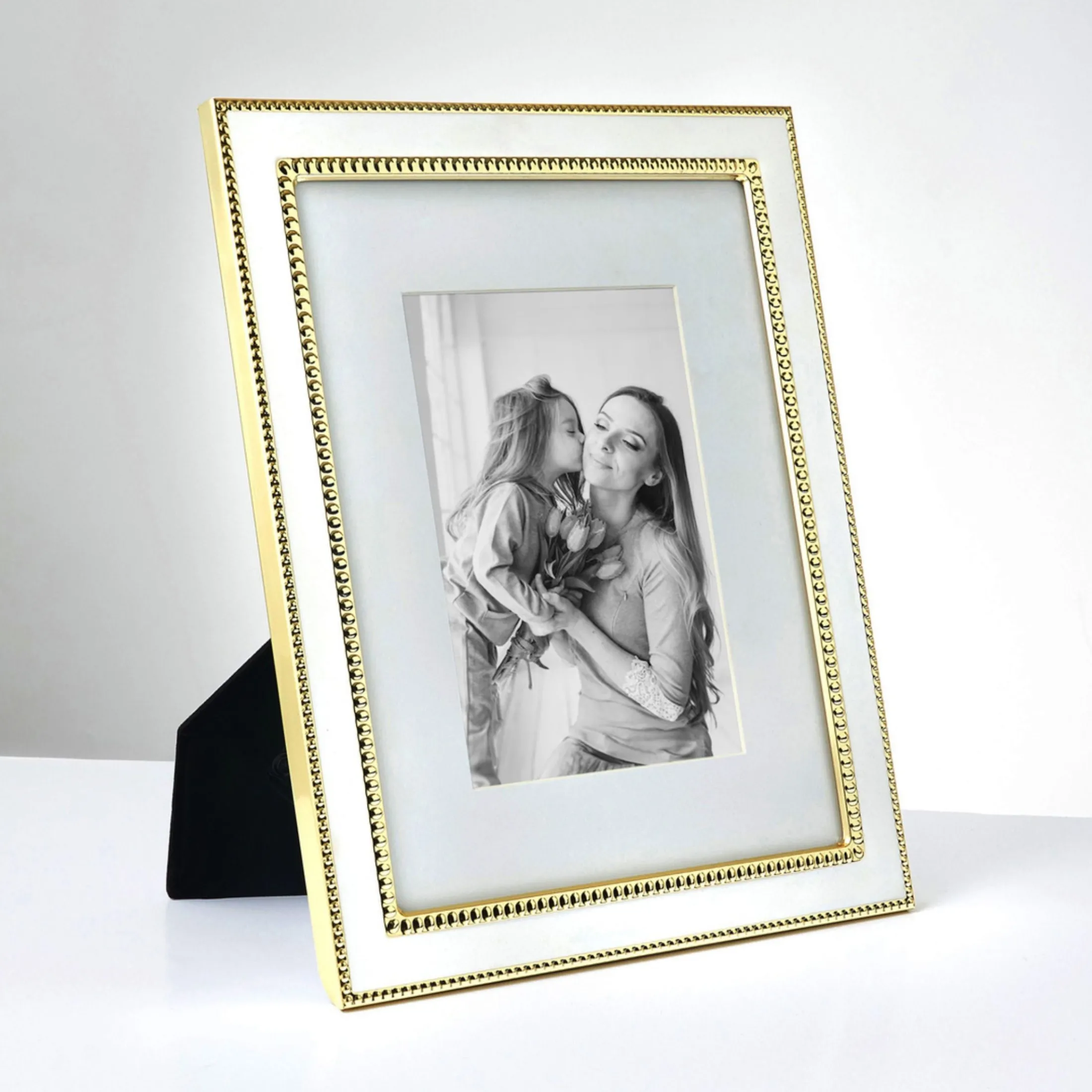 Transform your living space into a refined and exquisite gallery with the exquisite Bellamina frame. The white matte finish and intricate gold beaded border exude luxury and sophistication, adding a touch of glamour to any room.