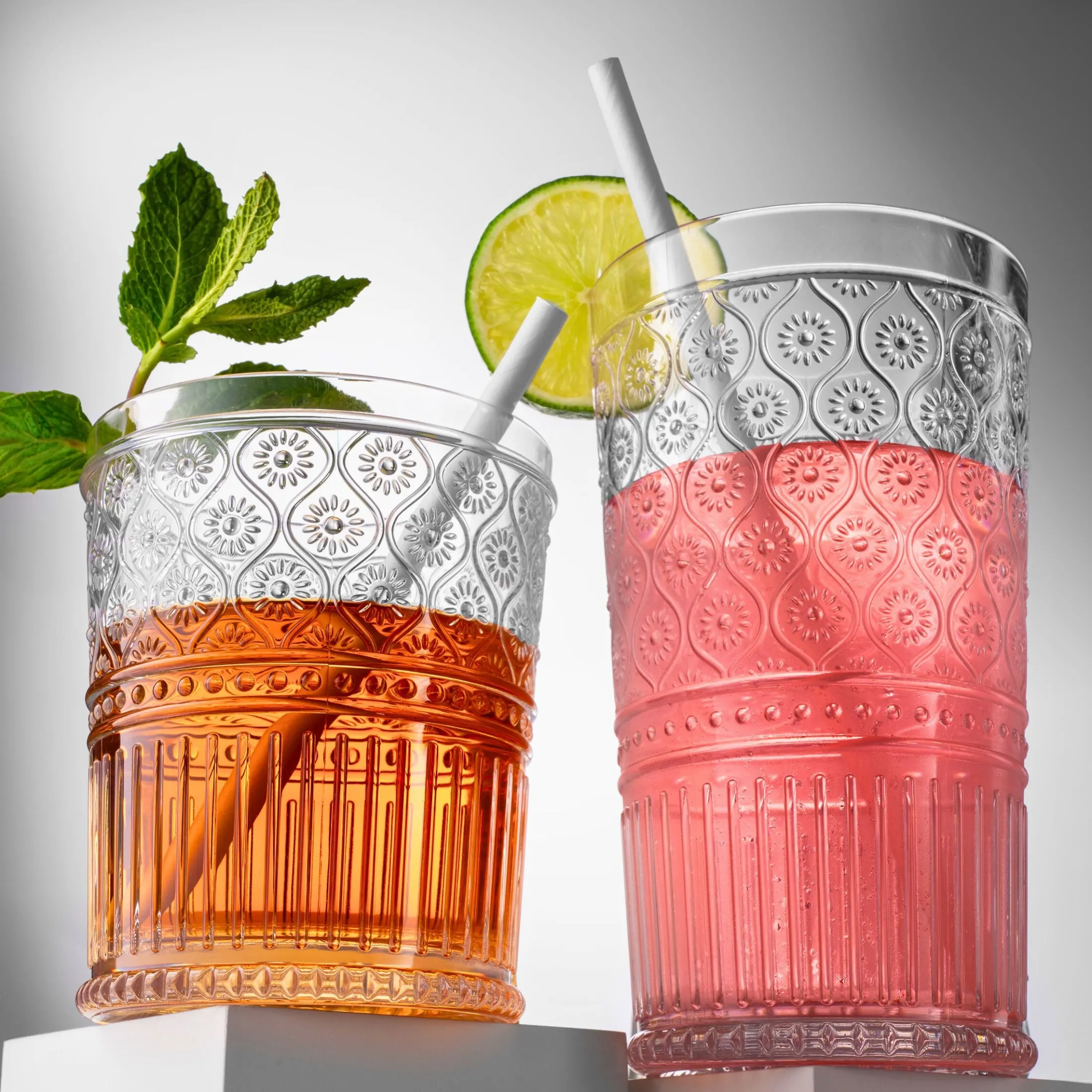 The Claro collection features bold colors, embossed texture, and coordinating designs, inspired by the Victorian era. This modern take on embossed glass is perfect for parties, special occasions, and everyday use. With a spring and summer aesthetic, these acrylic glasses are perfect for outdoor gatherings.
