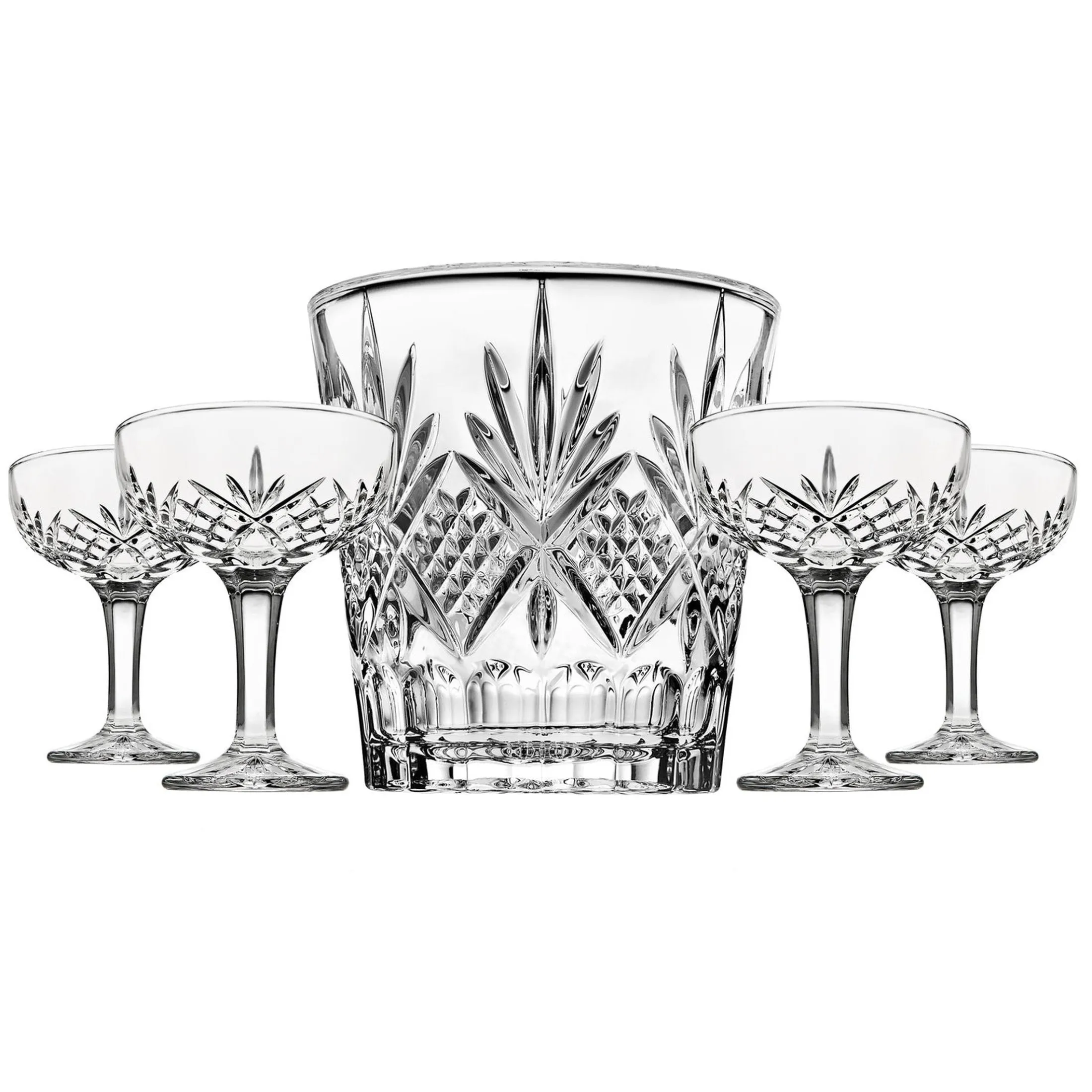 Our Dublin collection honors the rich tradition of crystal-cut glass, blending timeless elegance with intricate, brilliant-cut patterns. This exquisite five-piece set features a sparkling ice bucket and four matching champagne coupes, creating a sophisticated ensemble perfect for celebrations and special occasions. Elevate your entertaining experience with these refined pieces that combine classic craftsmanship and modern luxury.