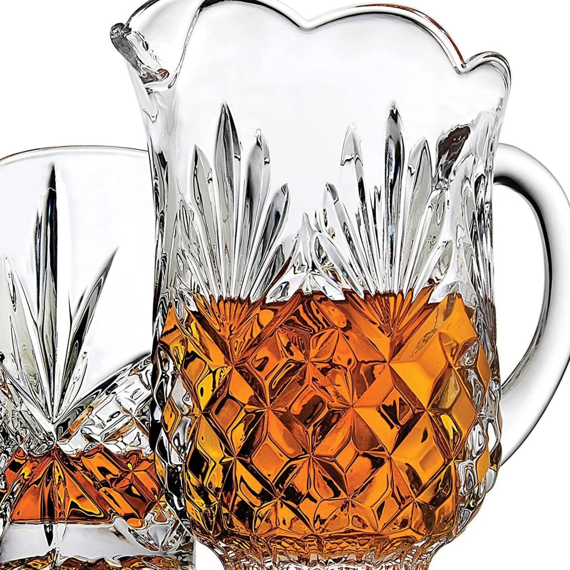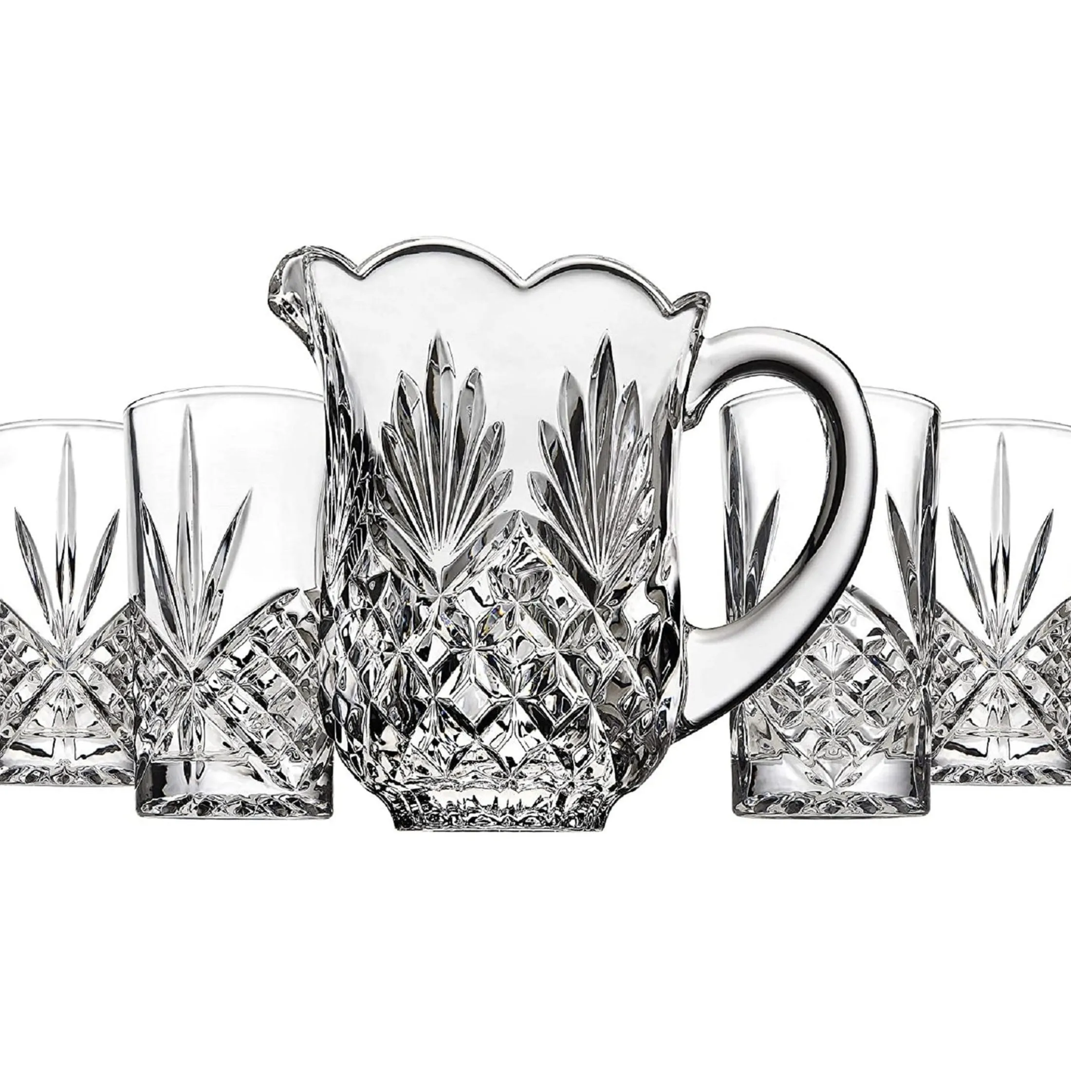 - The complete set includes one crystal pitcher and four matching highball glasses.