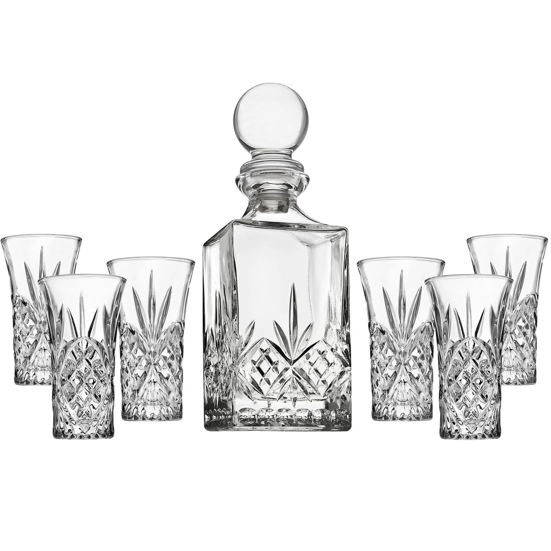 - This set features a beautifully crafted decanter with six matching shot glasses.