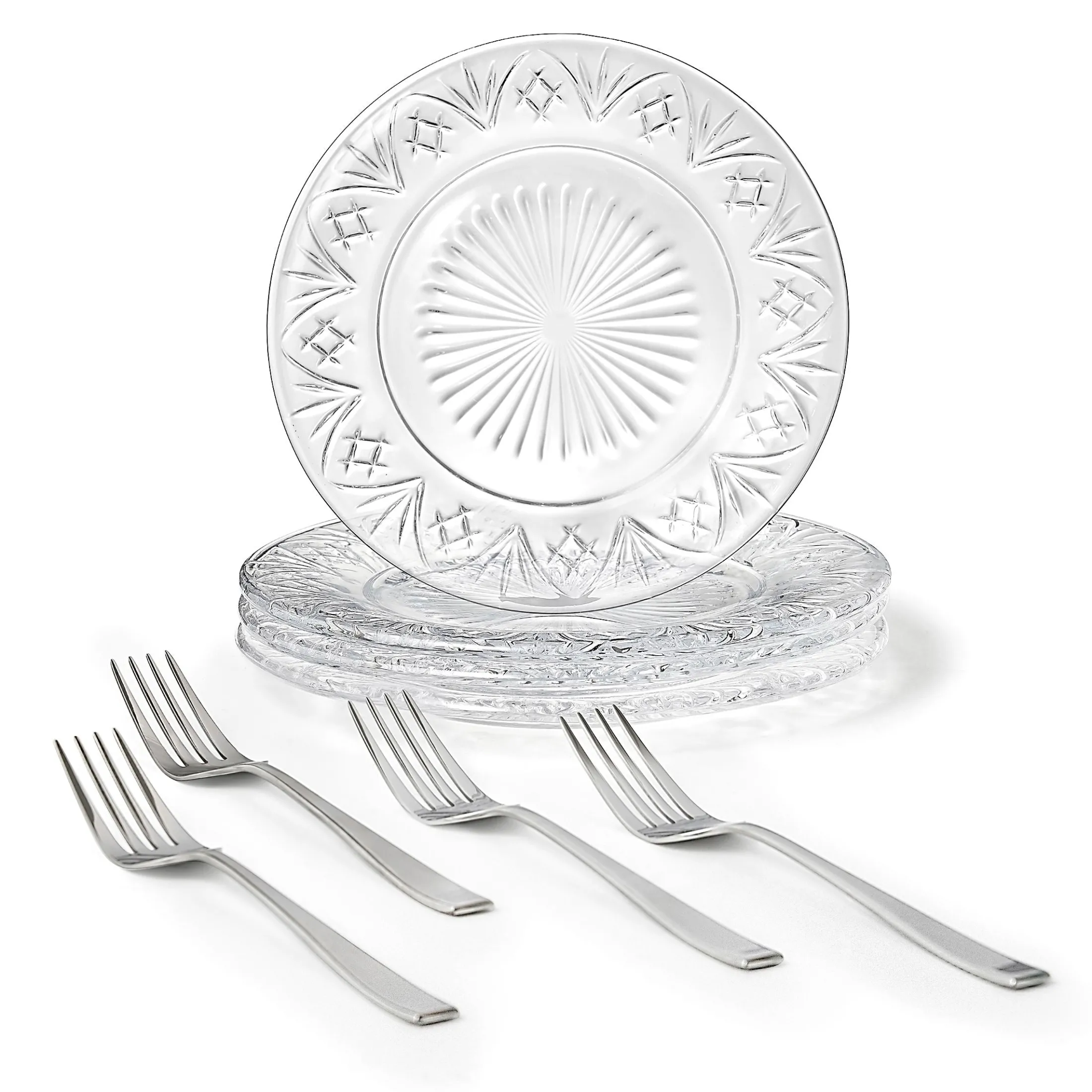 - Complete 8-piece set includes 4 crystal dessert plates and 4 matching forks.