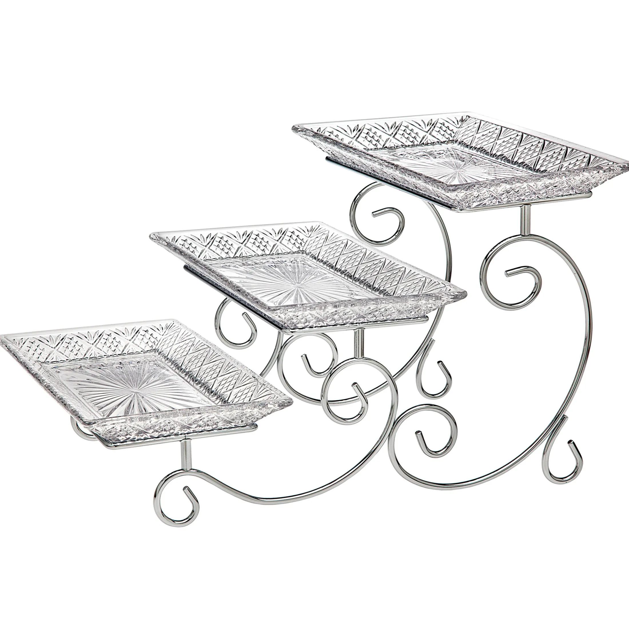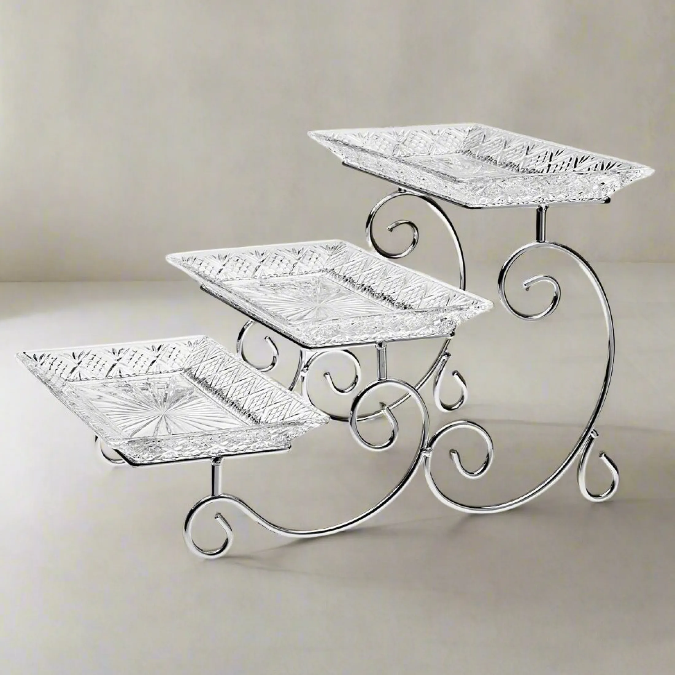 The Dublin three-tier server elevates entertaining with tri-level elegance, supported by a gleaming filigree stand. Its removable crystal trays provide both beauty and practicality, making it perfect for showcasing appetizers, desserts, or small bites. Combining classic design with modern versatility, this piece is both functional and decorative, adding sophistication to any occasion.