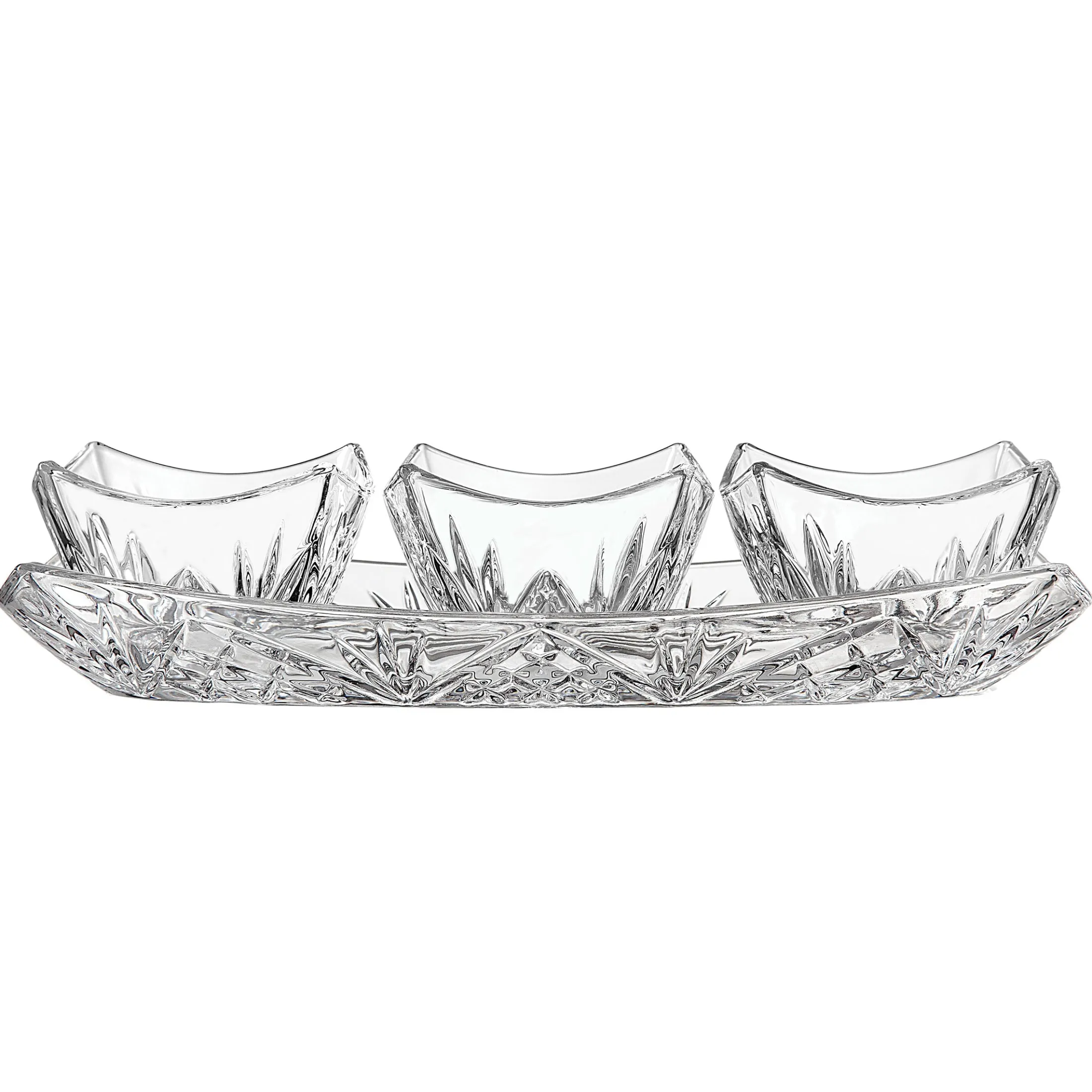 A refined way to serve and share. The Dublin Square 4-Piece Appetizer Server features a crystal-cut serving tray with three matching bowls that nest together beautifully. Use the set together for a coordinated presentation, or separate the bowls for effortless entertaining versatility.