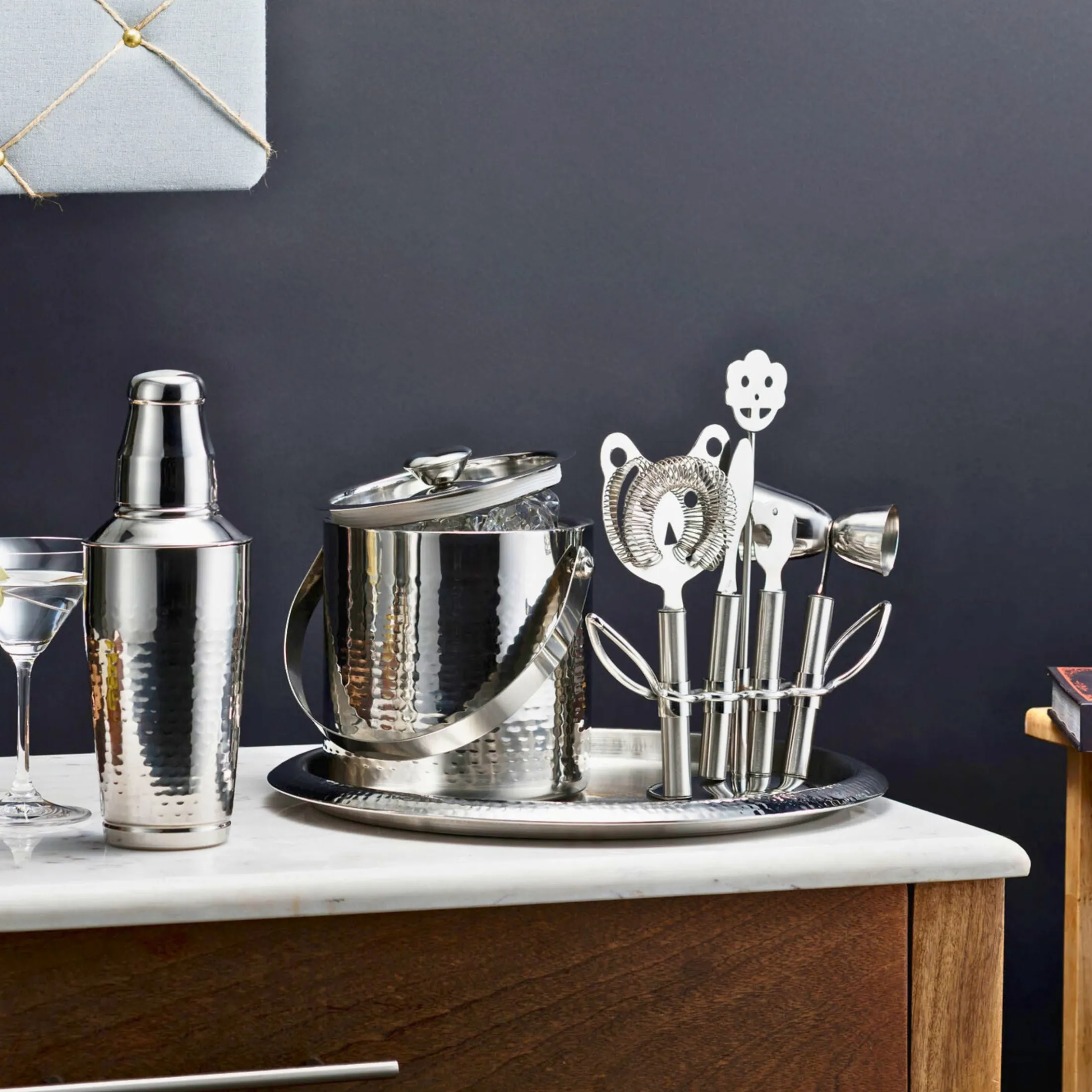 Crafted from stainless steel with a hammered texture, this classic nine-piece bar set is the perfect addition to any leisurely occasion. The exclusive design comprises the essentials for perfecting your favorite cocktails giving you that sophisticated edge—an elegant, tasteful heirloom to add a touch of luxury to special nights.