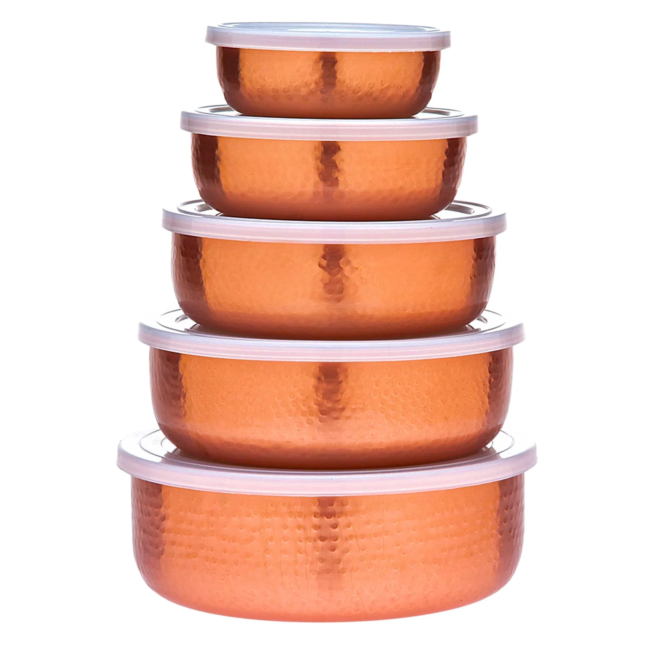 This 5-piece hammered copper storage bowl set is expertly constructed by hand. Every piece is a unique work of craftsmanship that will bring an artisanal touch to your kitchen or dining room. The bowls are hammered and polished for a gleaming, elegant finish that will stand out in any home. The beauty and durability of these pieces make them a lasting investment.