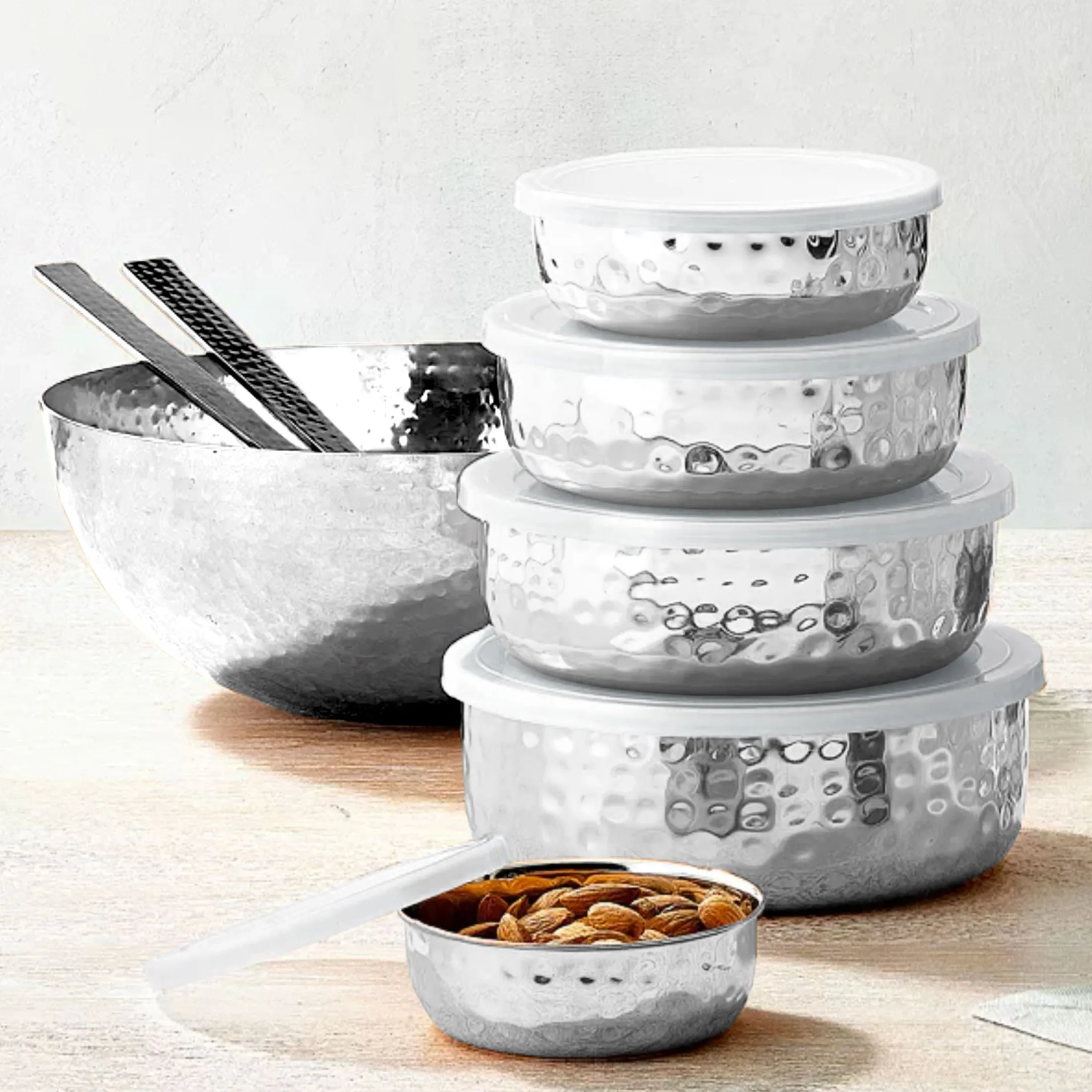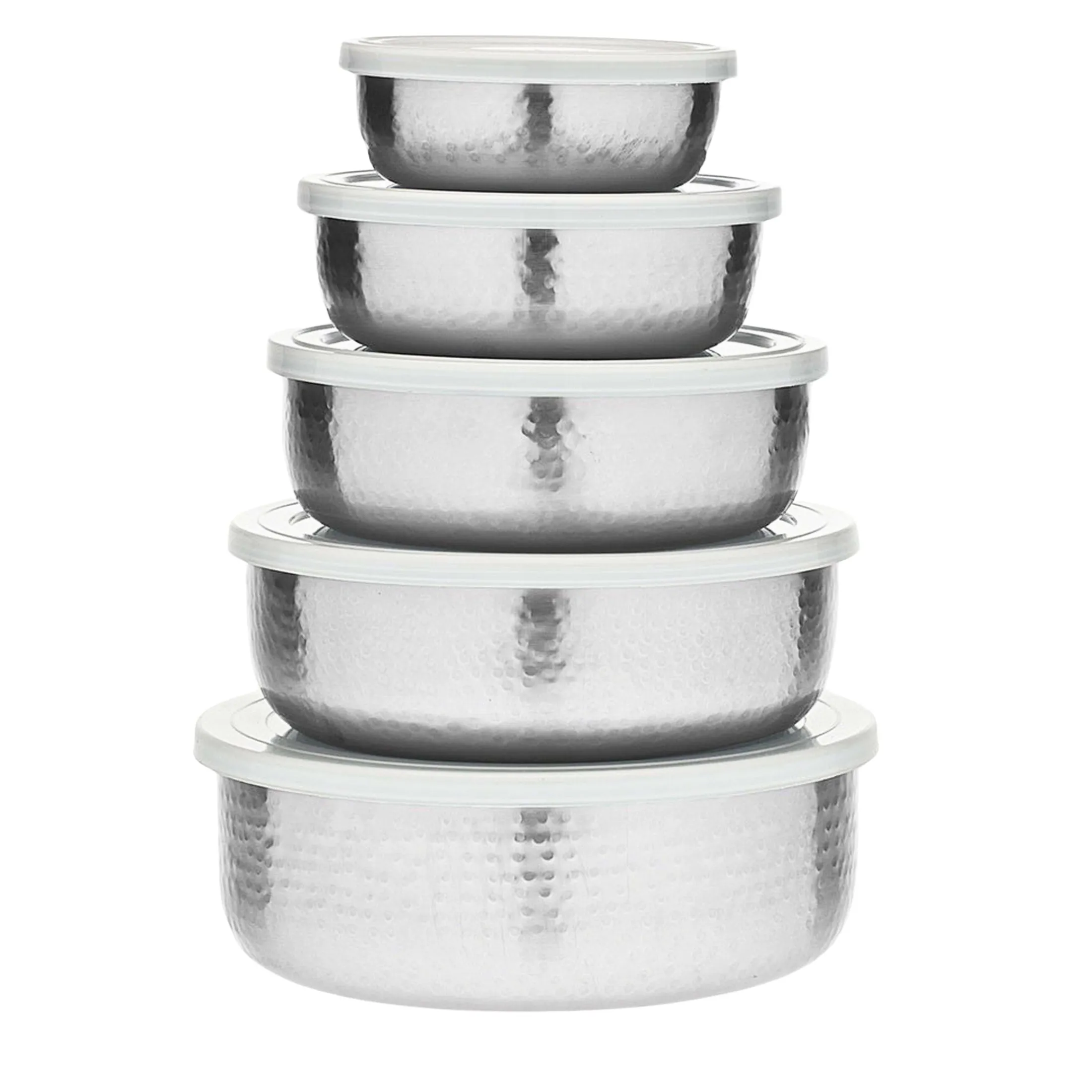 This 5-piece hammered stainless storage bowl set is expertly constructed by hand. Every piece is a unique work of craftsmanship that will bring an artisanal touch to your kitchen or dining room. The bowls are hammered and polished for a gleaming, elegant finish that will stand out in any home. The beauty and durability of these pieces make them a lasting investment.