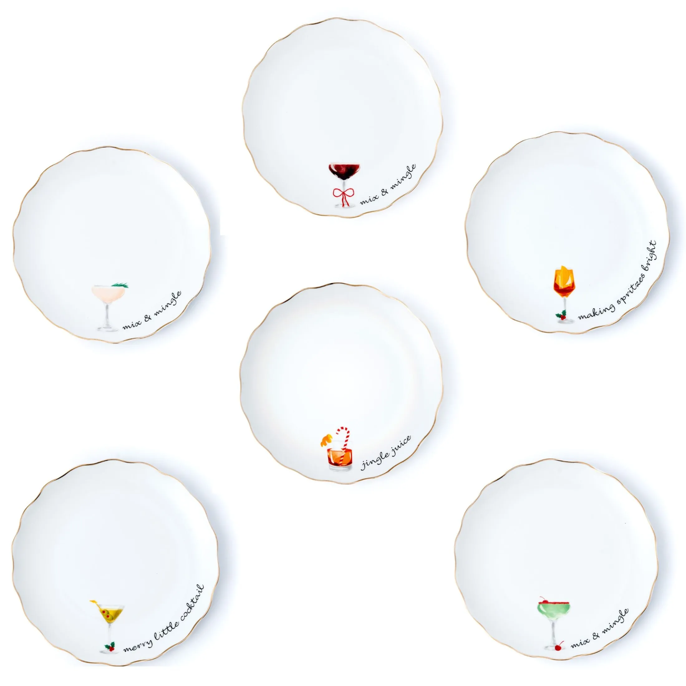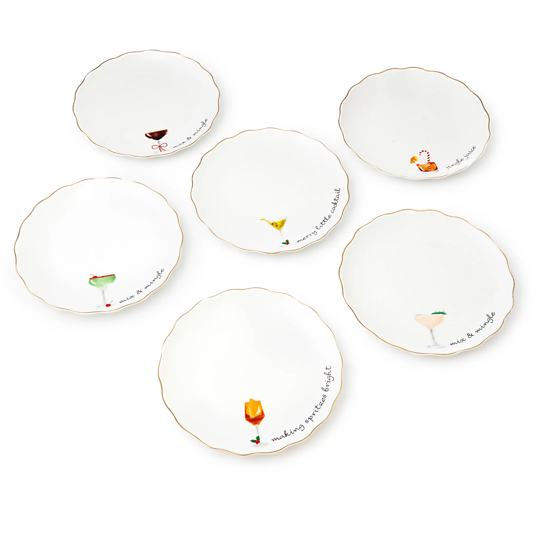 Bring festive spirit to every gathering with the Holiday Cheers Appetizer Plate Set. Crafted from fine porcelain and accented with a shimmering gold rim, each plate showcases playful holiday cocktail designs and cheerful sayings. Perfectly sized for hors d’oeuvres, desserts, or small bites, this set of six adds elegance and joy to your holiday entertaining. Pair with the matching coasters and serving platter for a coordinated seasonal table.