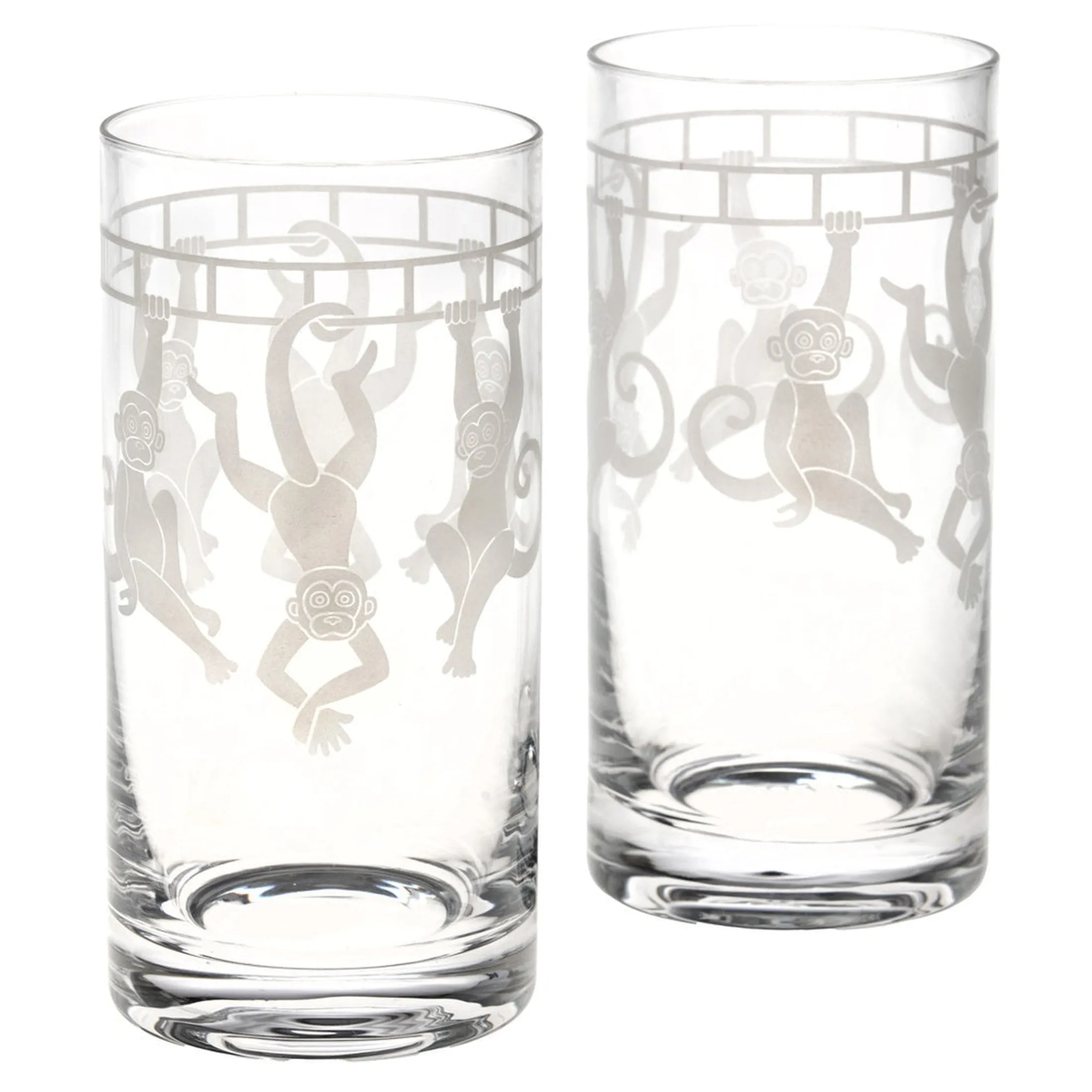 Monkey Highball embodies a fun design featuring hanging monkies. Their whimsical shapes make the set a charming addition to any glassware collection.