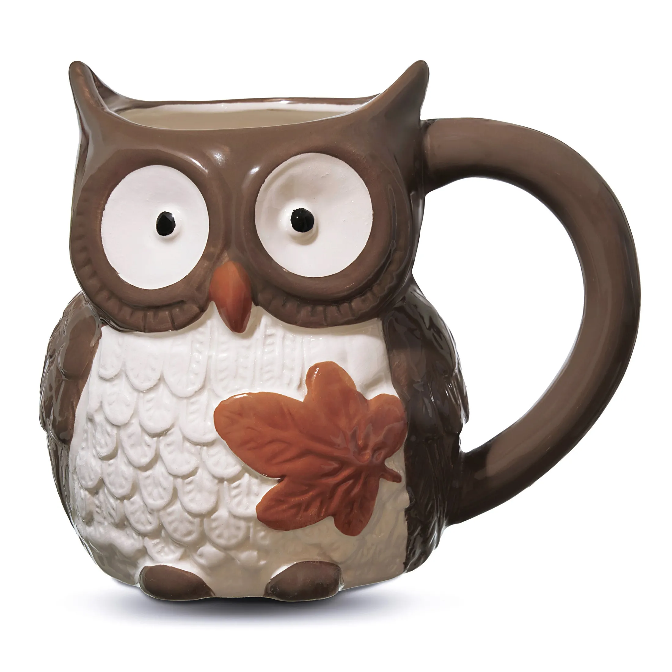- Set of 2 mugs shaped like brown owls holding a colorful fall leaf.
