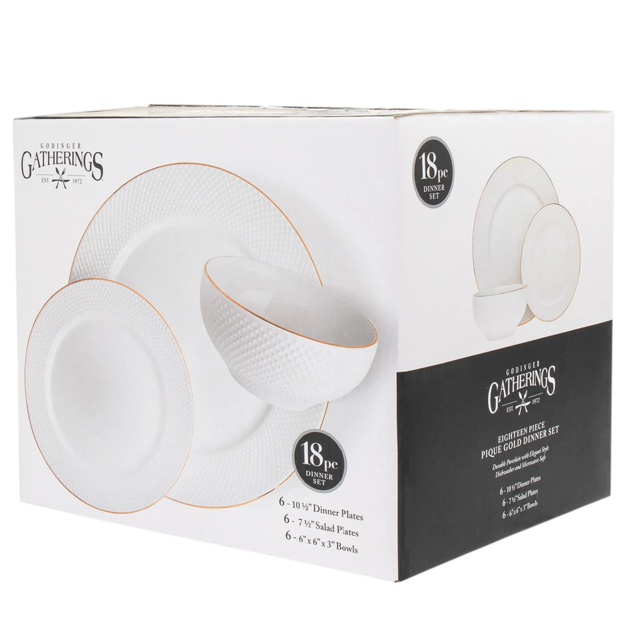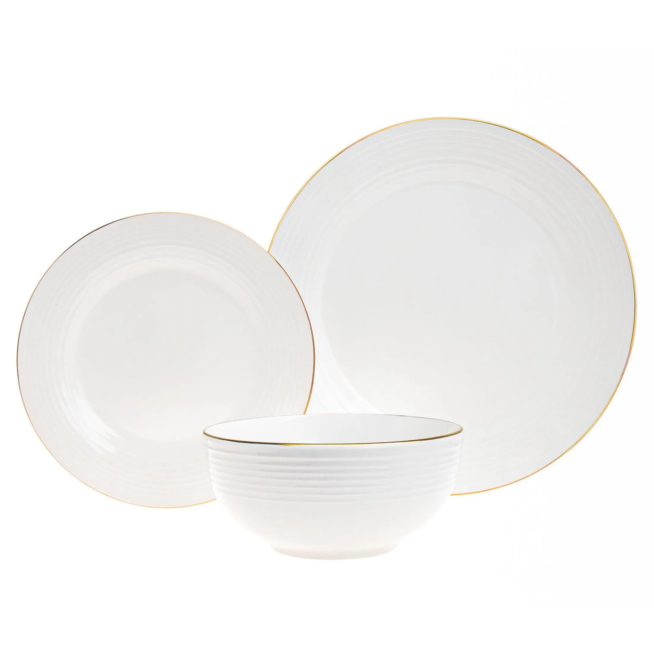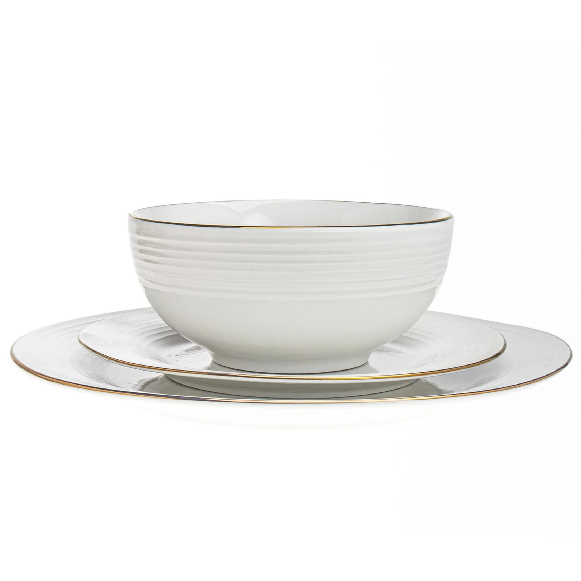 A slim gold band adds understated elegance to this set. With a classic, contemporary look, durability, and versatility, this gold-rimmed dinnerware has a simple, clean look with a sophisticated glimmer. This dinnerware is designed for long-term use and is perfect for anything from casual barbecues to elegant dinner parties. The high-quality, chip-resistant porcelain makes it easy to clean and maintain.