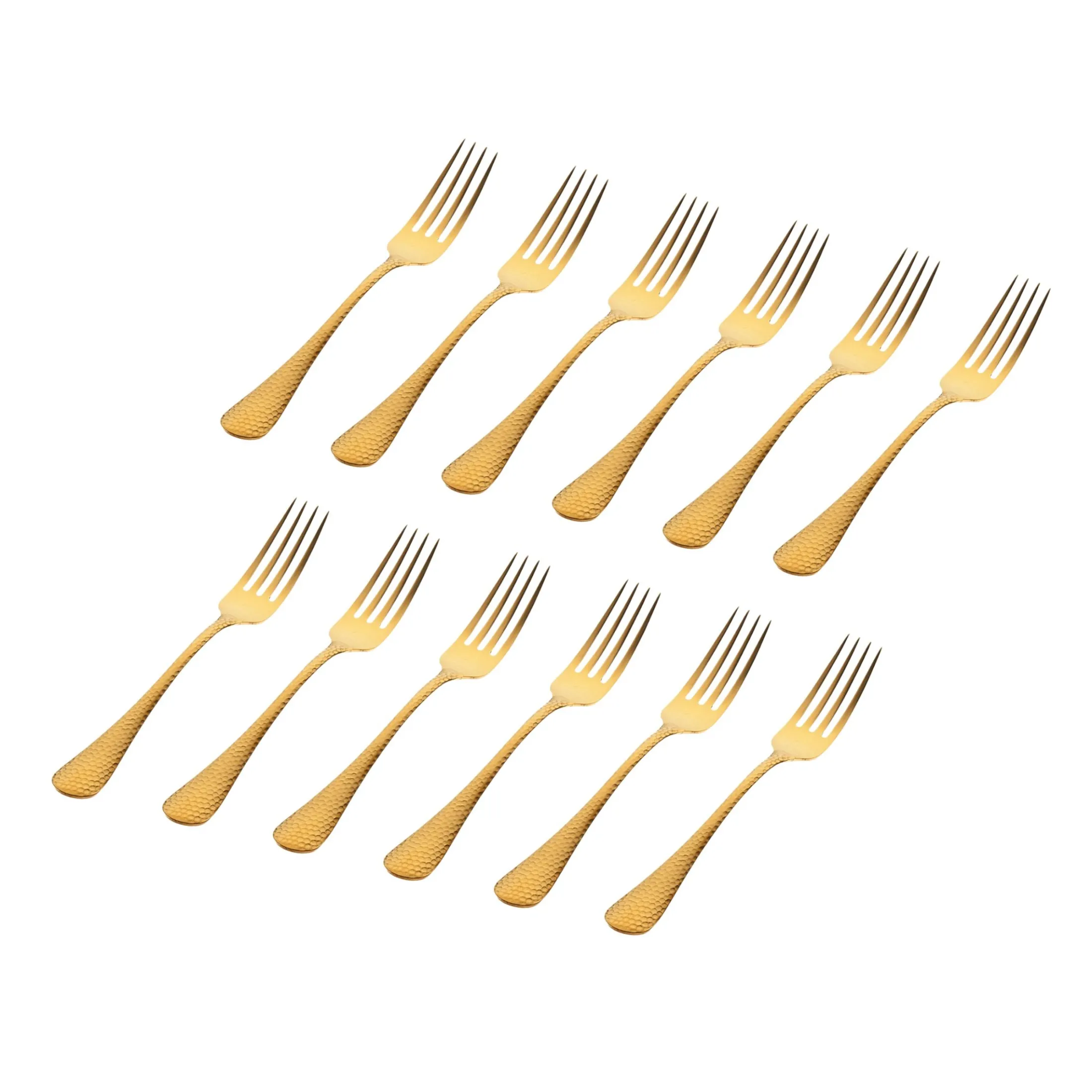 Crafted for everyday durability and classic style, this 12-piece Salem Matte Gold 18/0 Stainless Steel Dinner Fork Set delivers reliable performance meal after meal. Featuring a timeless hammered finish and clean, versatile design, these forks blend seamlessly with any table décor—perfect for daily use, entertaining guests, or completing your existing flatware set.