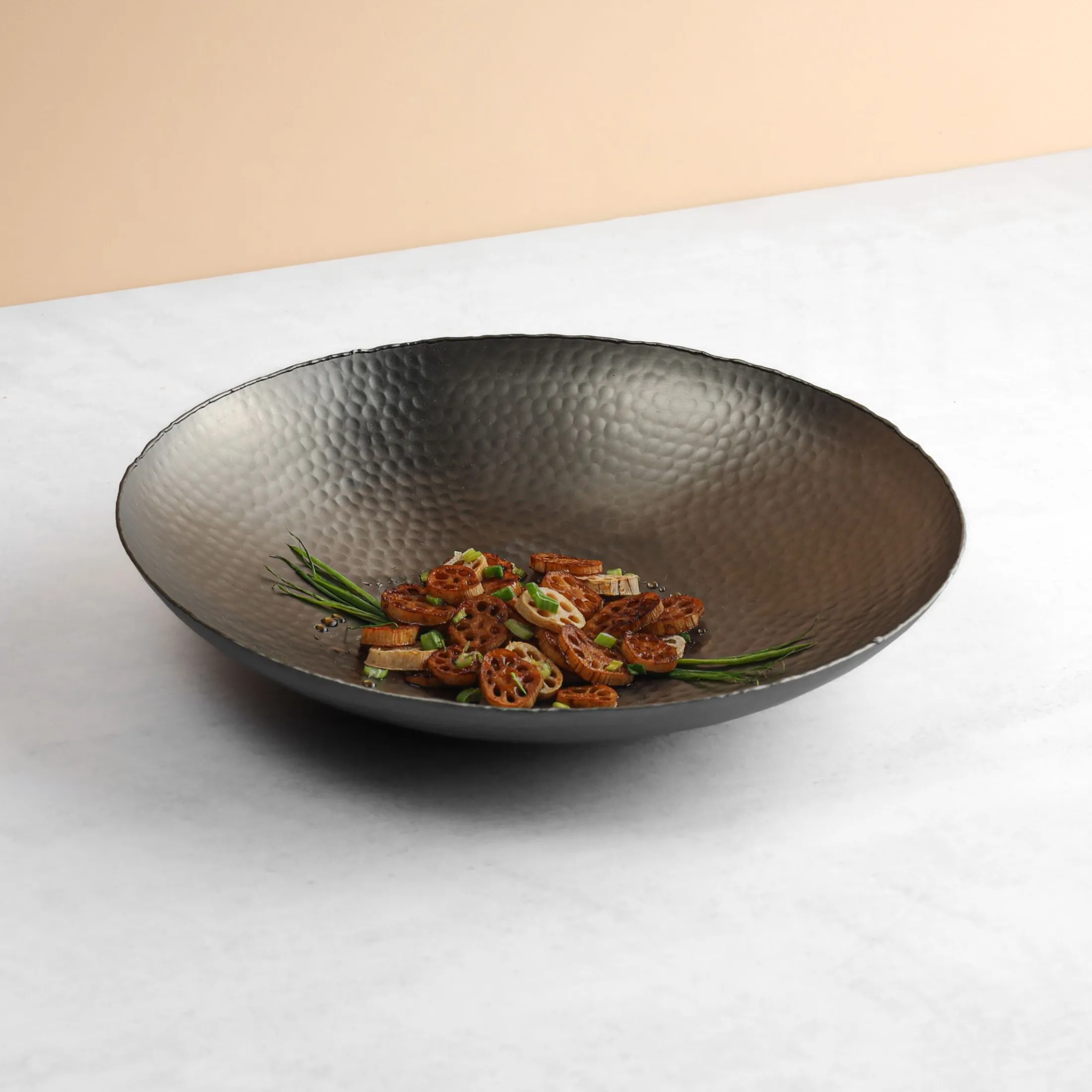 Bring bold sophistication to the table with the Temari Hammered Gunmetal Round Platter. Handmade in India, this versatile piece is crafted from stainless steel with a hammered gunmetal finish that creates striking depth and texture. Designed with a sleek, contemporary silhouette, it balances artisanal craftsmanship with modern elegance for a look that’s both refined and dramatic. Ideal for serving appetizers, desserts, or as a striking centerpiece display, this round platter transitions seamlessly from casual dining to elevated entertaining. With its distinctive finish and refined details, it ensures every presentation makes a lasting impression.