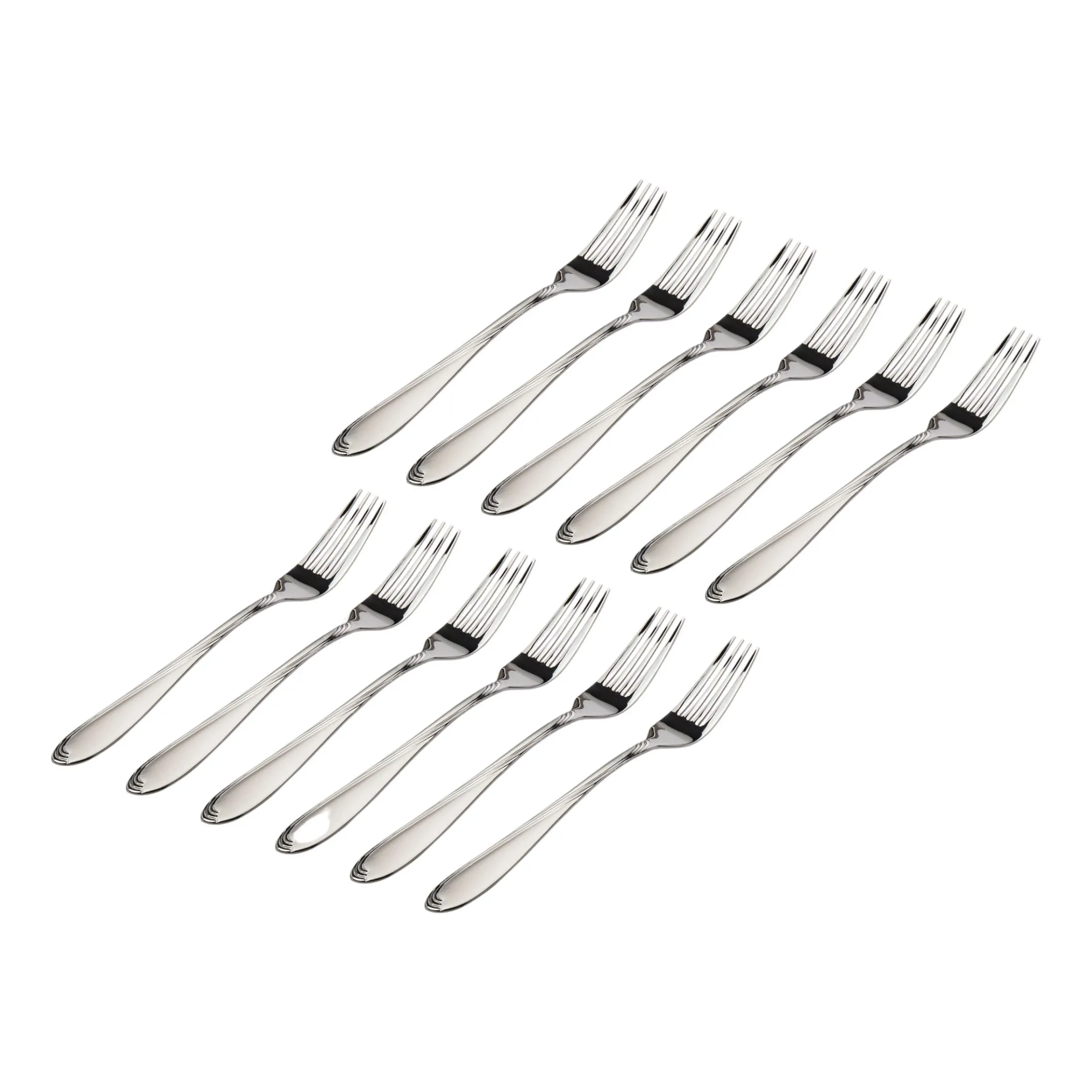 Designed to bring modern sophistication to your table, this 12-piece Wave Sandblast 18/0 Stainless Steel Salad Fork Set features a sleek wave pattern and a contemporary sandblasted finish. Crafted from durable stainless steel, these forks are perfect for everyday meals or adding a stylish touch when entertaining.