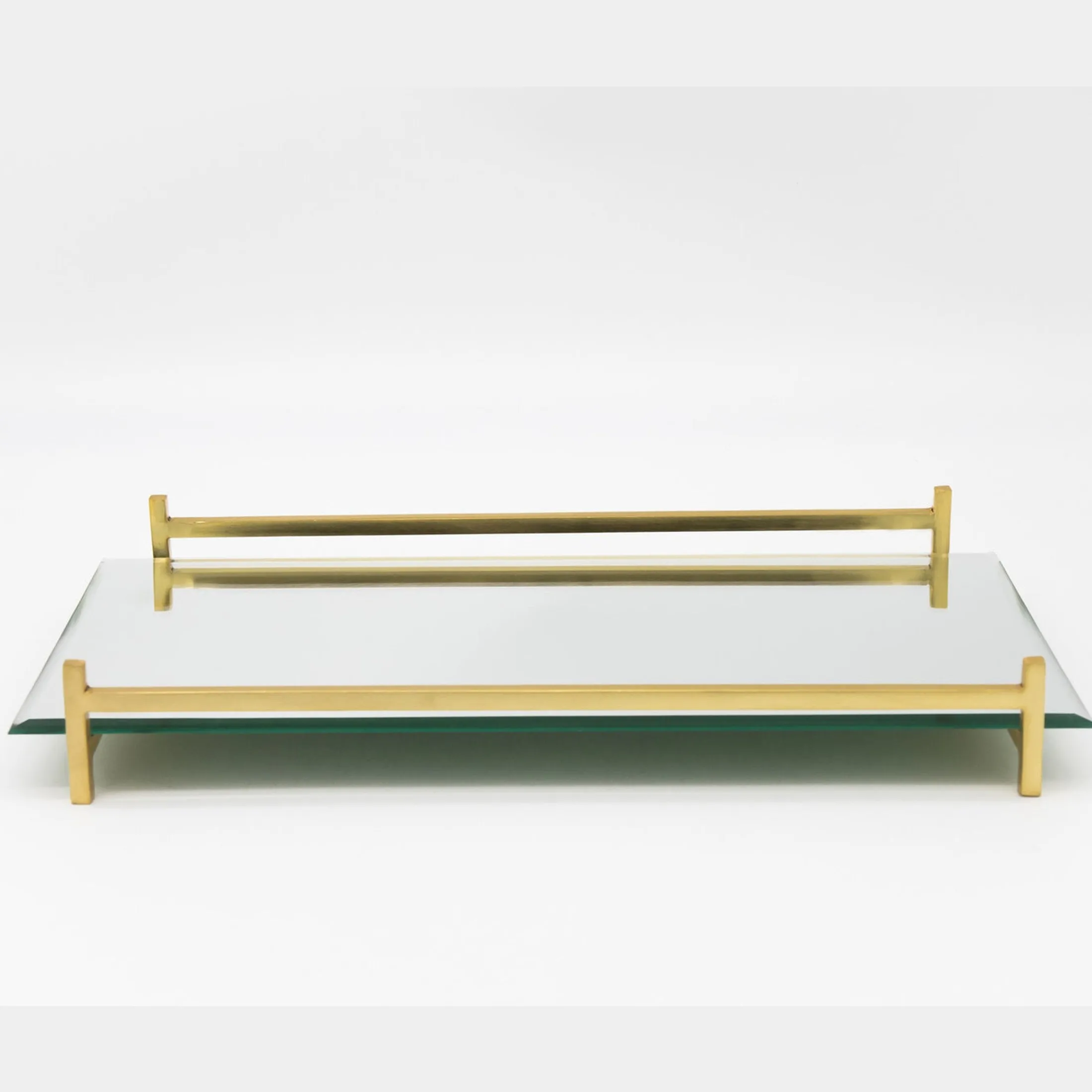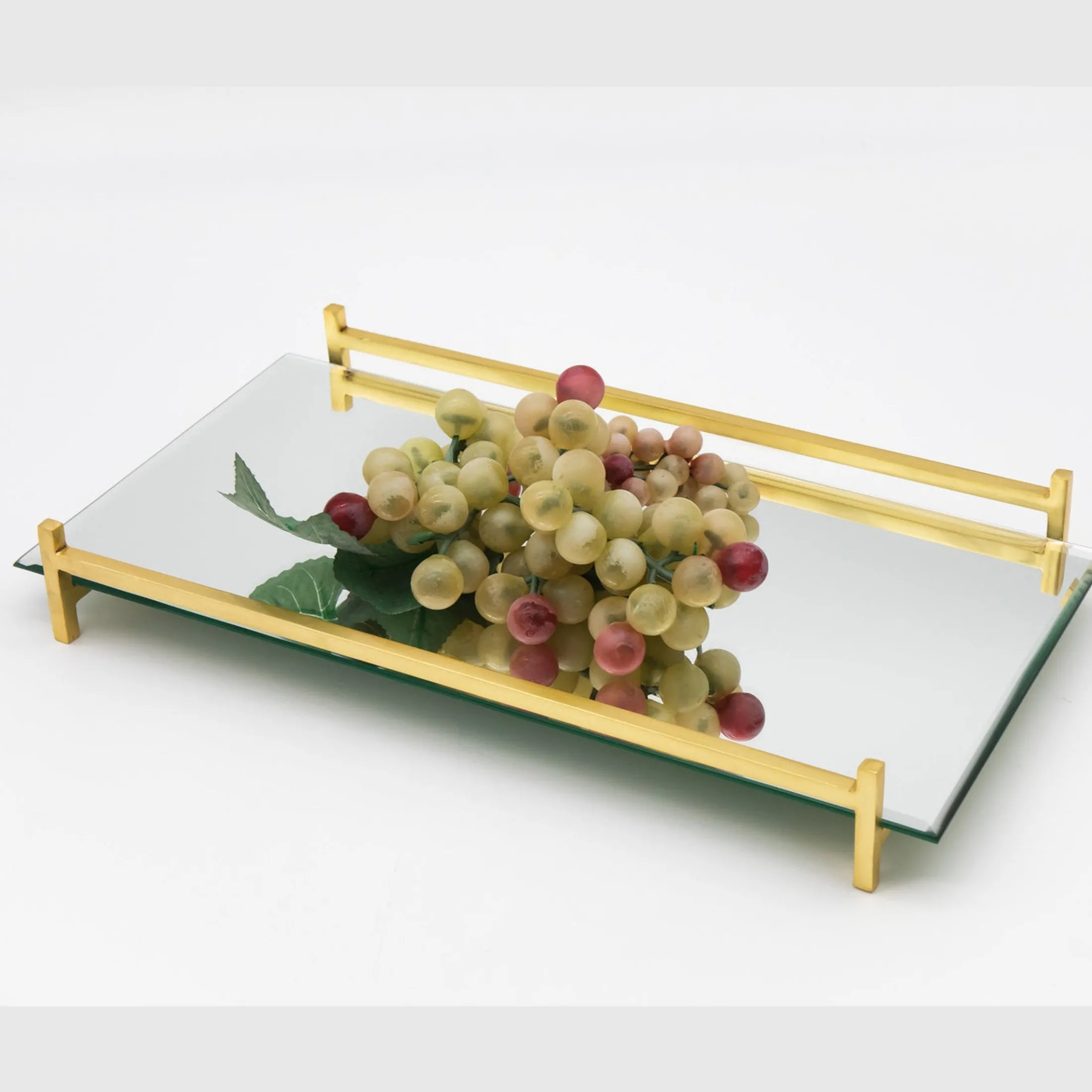 An opulent tray, featuring gleaming gold metal accents and a mirrored surface creates a dazzling display for serving and vanity purposes. Its modern yet timeless design is sure to elevate any dining, vanity, or entertainment experience.