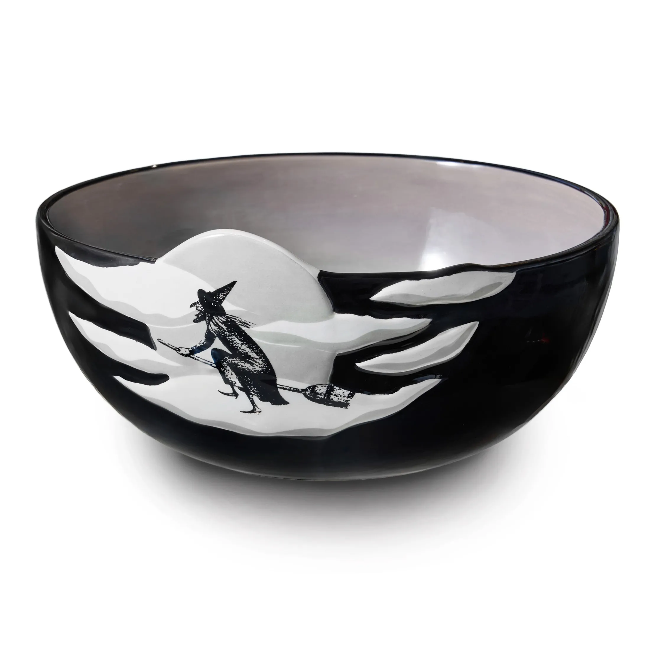 - Features a witch on her broomstick in front of a glowing full moon.